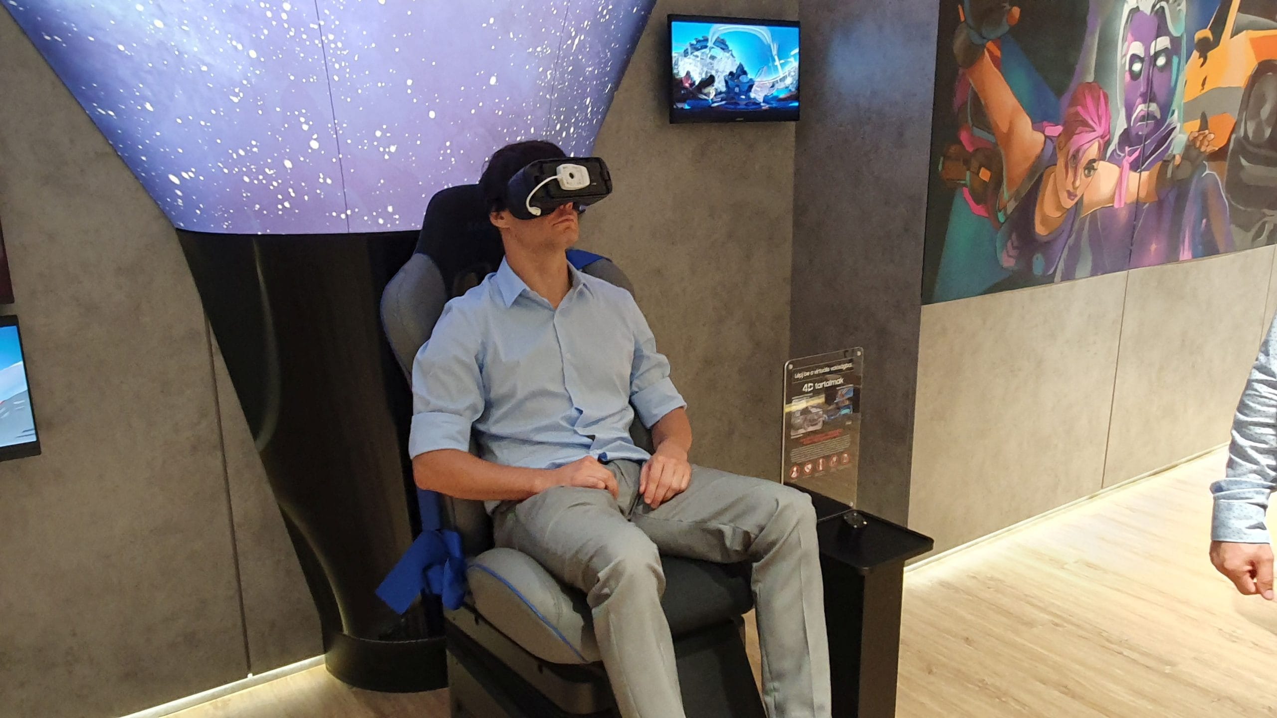 Ugyanennek szellemében alakítottak ki fent egy VR szentélyt, ahol többek között egy 4D-s fotelben próbálhatóak ki a vállalat virtuális valóság megoldásai. Egyrészt tényleg sokat hozzá tesz az élményhez, ha a látvánnyal együtt dinamikusan mozgunk mi is, másrészt pedig a nézőközönségnek is vidám perceket szerez a székben ülő, grimaszoló, a semmiben hadonászó, sisakkal a fején ide-oda forduló embertársuk.
