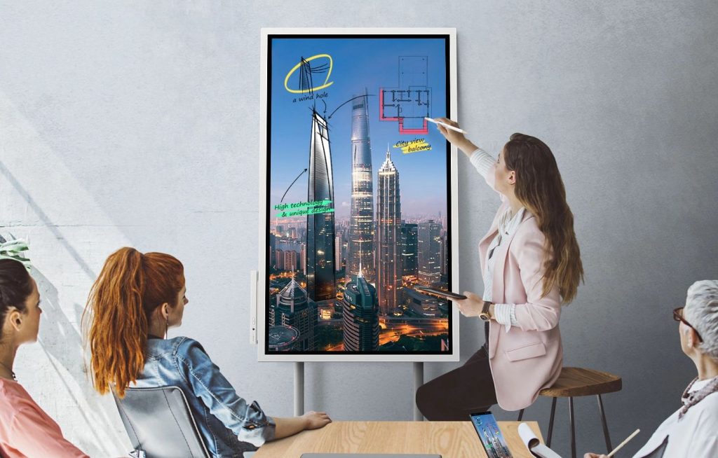 Képes kapcsolatot teremteni különféle vezeték nélküli technológiák révén is a kompatibilis berendezésekkel, így az azokon végrehajtott változtatások pillanatok alatt megjelenhetnek a kijelzőn. Sőt, egyszerre akár négy felhasználó is dolgozhat így rajta egy időben, ami ideálissá teszi kisebb munkacsoportok számára is. Ezen kívül természetesen az is megoldott, hogy magán a Flipen végrehajtott módosításokat szinkronizáljuk más, kapcsolt berendezésekre például számítógépre, tabletre vagy telefonra, sőt a kész tartalmakat aztán megoszthatjuk e-mailben, pendrive-on vagy egyéb hálózati meghajtókon. Egy szó mint száz: különféle kreatív tevékenységek, tervezés, brainstorming során egy ilyen masina főnyeremény lehet! A tervezése során is figyelembe vették az irodai, munkahelyi környezet sajátosságait. Így az alapkiszerelés részeként ellátták egy gurulós állvánnyal, aminek révén a nagy mérete ellenére is könnyen mozgatható egyik tárgyalóból vagy helyiségből a másikba. Ezenkívül oktatási környezetben is ideális, a hagyományos offline tábla helyett, sőt a projektorokat is helyettesítheti, a tananyag utána megosztható mindenkivel, így az nem vész el.