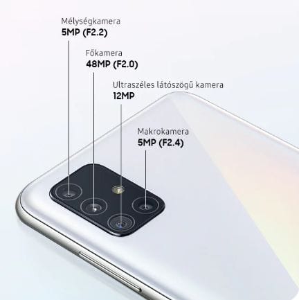 Adattárolásra szolgáló memória: 64 GB, Nem különösebben sok, de arra bőven elég, hogy ne kelljen spórolni semmivel. Nyugodtan lehet videózni, nagy appokat letölteni, fotózni, egy darabig tutira elég lesz a hely a Samsung Galaxy A51 telefonon.