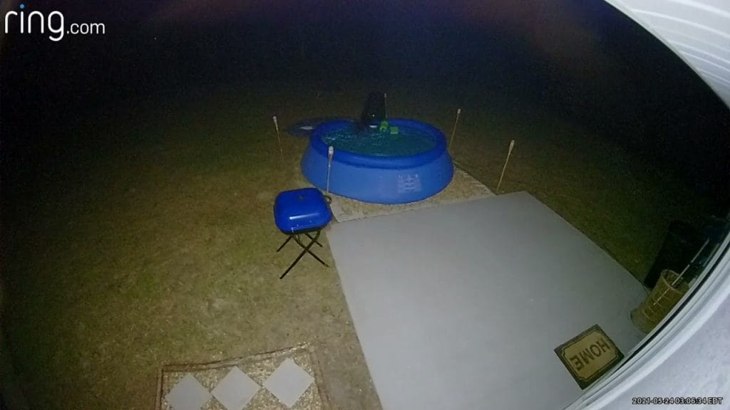Az éj leple alatt egy fekete medve tévedt be egy floridai család otthonába, majd csobbant egyet a kertben található felfújható medencében.