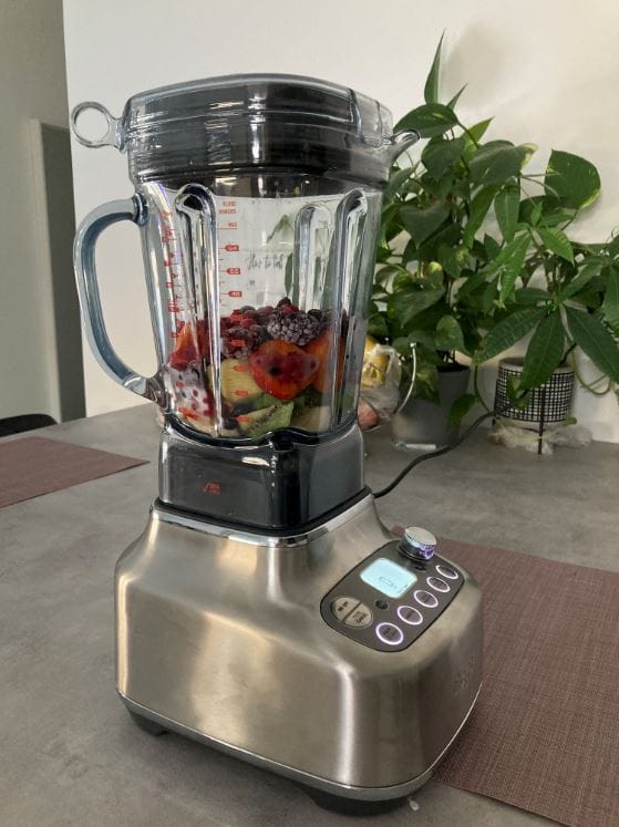 Kezdjük a száraz adatokkal. A SBL920 kódnevű Sage Super Q turmixgép nagy, 1800 W-os teljesítménnyel rendelkezik, teljes terhelésnél a pengerendszer akár a 300 km / h sebességet is elérheti. A két literes mixelőedény nem egy sima műanyagból, hanem BPA mentes Tritan anyagból készült, amely állítólag ellenáll a szélsőséges hatásoknak, és mosogatógépben is mosható. Ugyanez igaz a 0.7 literes turmix-tartályra is, amelyet kisebb adagok esetében érdemes használni. Érdemes megjegyezni, hogy a készülék az intelligens funkcióinak köszönhetően képes felismerni, hogy mixelőedény vagy a turmix-tartály van-e csatlakoztatva, és ennek megfelelően optimalizálja a teljesítményt.