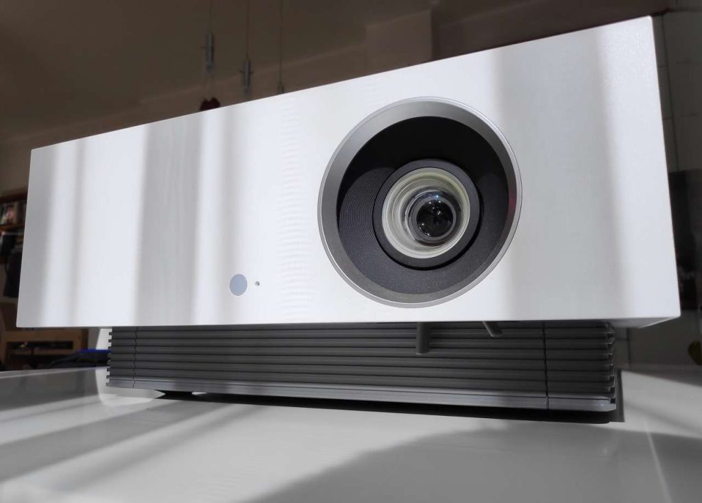 Amikor megérkezett a projektor megdöbbentő méretű dobozt kaptam, és a kivett projektor igazolta meglepődésemet. Közel sem hordozható, eseti használatra, hanem fix asztali vagy még inkább mennyezeti elhelyezésre tervezték. A mérete a házimozi projektorok jellemző méretének több, mint kétszerese 34*41*14.5cm és 12 kg a tömege! A fehér alapszín és szürke alap az oldalsó hűtőbordázattal, szögletes minimalista design-al elegáns, ami nappali mennyezetén elhelyezéskor kimondottan előnyös lehet – jobban beleolvad a környezetbe. Az 1,6-szoros zoom-nak köszönhetően könnyedén a szoba igényeihez illeszthető az elhelyezése, és erre segít rá a nagy mértékű manuális vízszintes és függőleges lencse eltolás lehetősége.